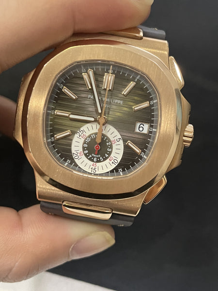 For sale is the exquisite Patek Philippe Nautilus Chronograph, reference 5980R. A masterpiece of horological design, this timepiece pairs the iconic Nautilus silhouette with luxurious rose gold craftsmanship and a sophisticated chronograph complication, making it a standout piece in any collection.