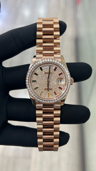 Presenting the luxurious Rolex Day-Date 36, reference 128345RBR. Crafted from Rolex's proprietary 18k Everose gold and adorned with a diamond-set bezel, this timepiece is the pinnacle of elegance and sophistication. Ideal for those seeking an iconic watch that combines timeless style with exquisite craftsmanship.
