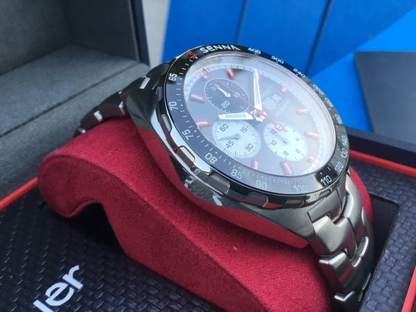 • Fixed stainless steel bezel with a tachymeter scale in bold red, featuring the iconic "S" logo of Ayrton Senna