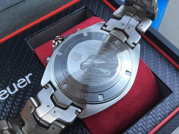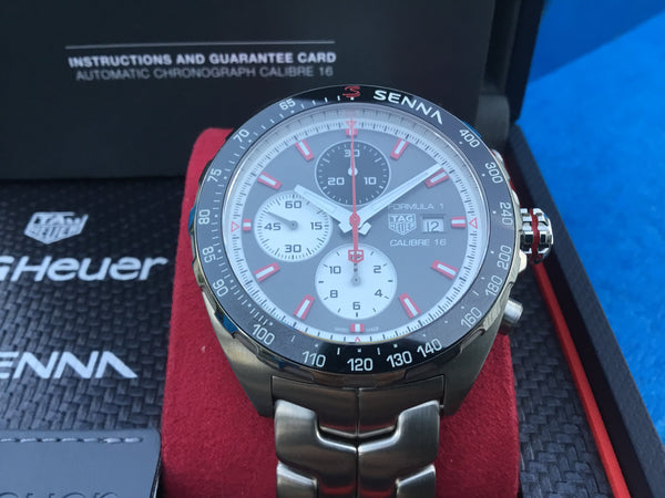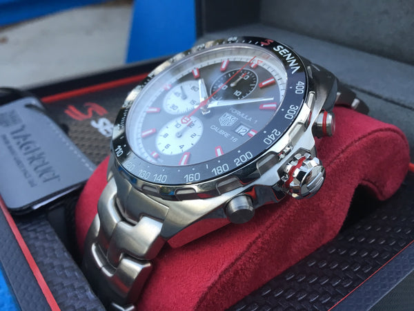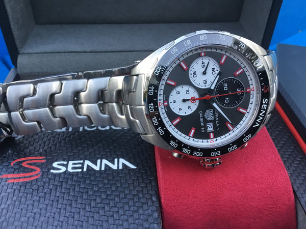 This TAG Heuer Formula 1 Senna Calibre 16 is in excellent condition, with the case and bracelet showing minimal wear. The movement has been fully serviced and is keeping precise time. A must-have timepiece for racing enthusiasts and TAG Heuer collectors alike.