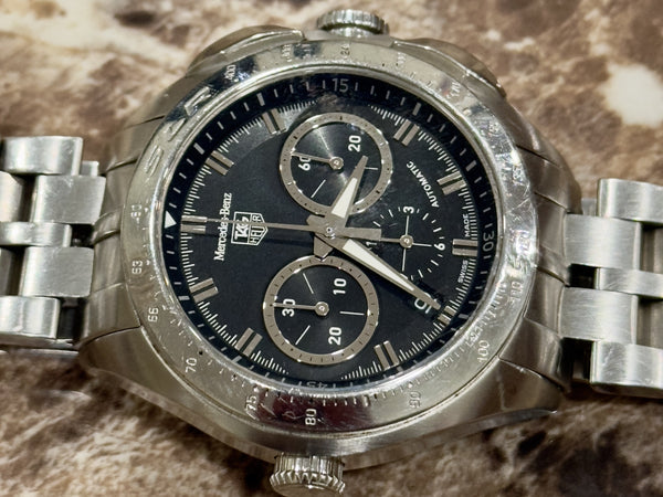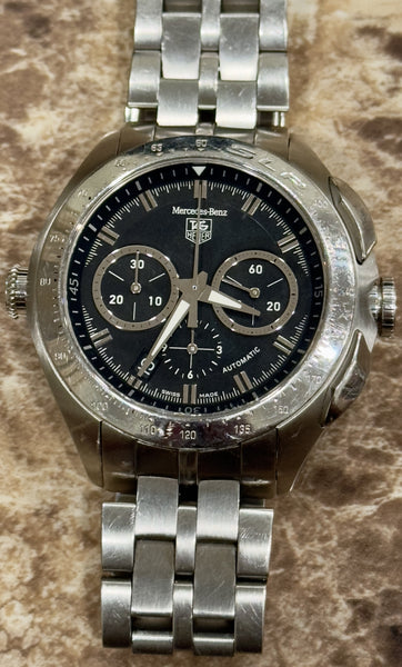 For sale is the remarkable TAG Heuer SLR Caliber 17, reference CAG2110, a special collaboration between TAG Heuer and Mercedes-Benz. Designed to celebrate the legendary Mercedes-Benz SLR McLaren, this timepiece embodies high-performance engineering and luxury.